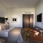 The hotel boasts elegantly appointed rooms and suites, each featuring modern amenities such as 40-inch flat-screen TVs, complimentary high-speed Wi-Fi, espresso machines, and luxurious bathrooms with walk-in rain showers. Guests can unwind at the rooftop pool, indulge in rejuvenating treatments at the Aegeo Spa, or maintain their fitness routine at the 24-hour gym.